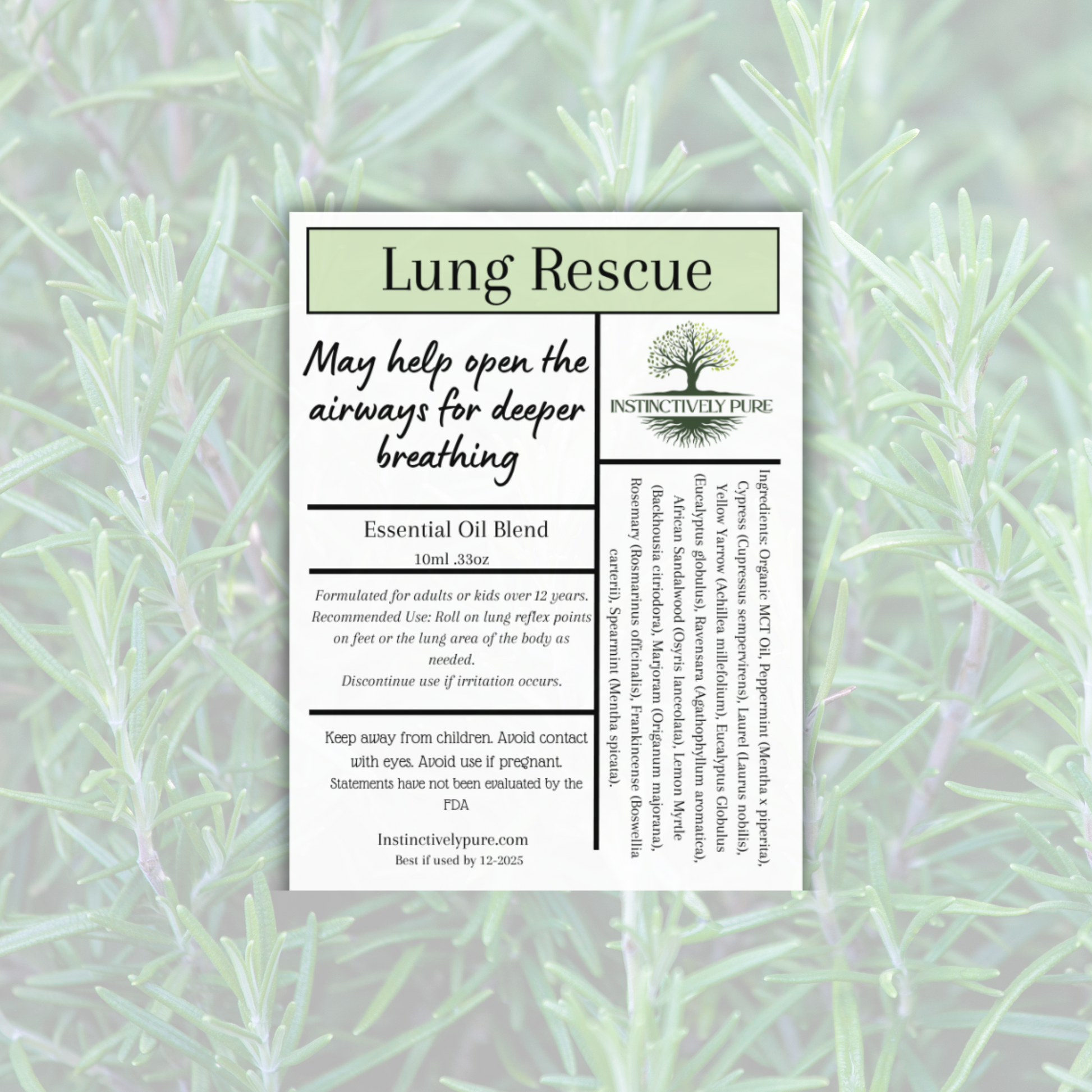 Lung Rescue Respiratory Blend is crafted with an uplifting combination of essential oils, diluted in a convenient roll on application with Fractionated Coconut Oil, Laurel Leaf, Peppermint, Yellow Yarrow, African Sandalwood, Frankincense, Marjoram, Spearmint, Eucalyptus, Tea Tree, Lemon Myrtle, Ravinsara, and Cypress. Lung Rescue delivers a calming and refreshing vapor sensation that works to support clear airways and promote easy, natural breathing.