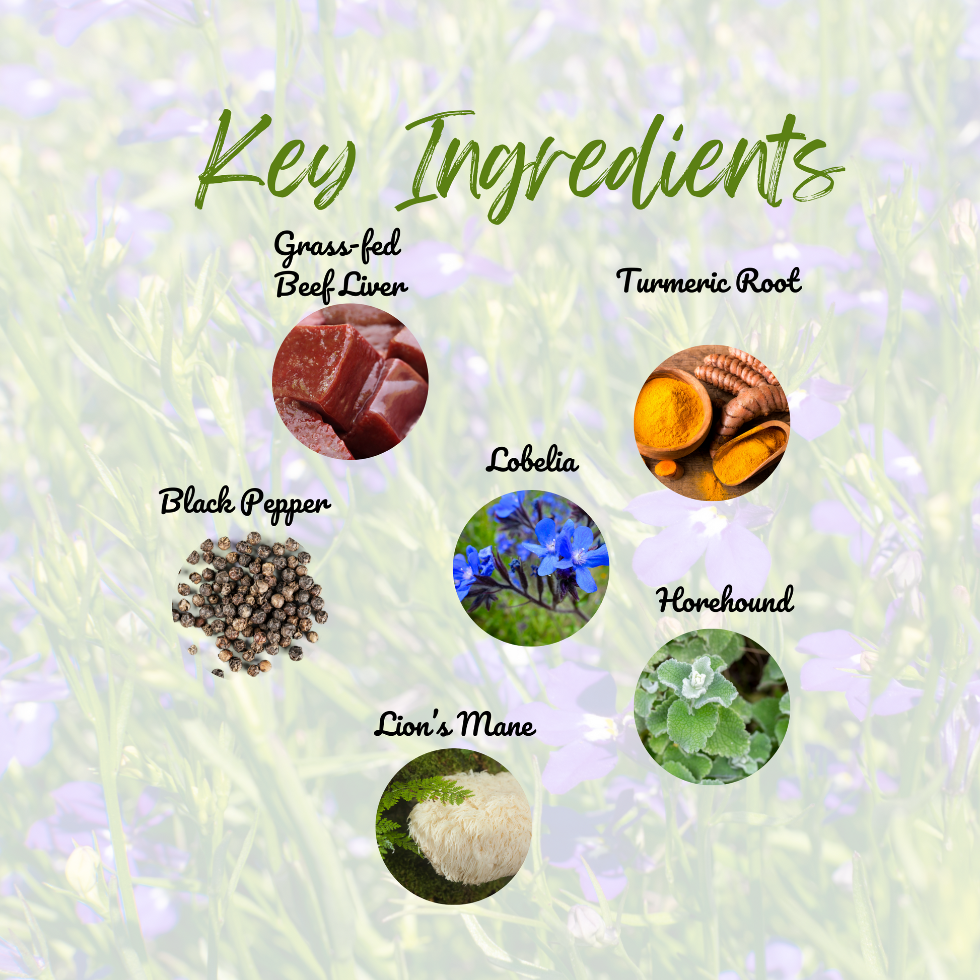 Organic* Ingredients: Beef liver* (Argentine Grass-Fed), Lobelia leaf*(Lobelia inflata), Orange peel* (Citrus sinensis), Carrot powder* (Daucus carota), Lysine, Horehound* (Marrubium vulgare), Pau D’Arco* (Tabebuia impetiginosa), Lemon peel* (Citrus limon), Lion’s Mane* (Hericium erinaceus), Yarrow root* (Achillea millefolium), NAC (N-acetyl cysteine), Propolis*, Cinnamon Bark* (Cinnamomum verum), Slippery elm* (Ulmus rubra), Turmeric Root* (Curcuma longa), Nettles* (Urtica dioica), Alanine, Red Reishi mushroom* (Ganoderma lucidum), Black pepper* (Piper nigrum), Threonine, Milk Thistle* (Silybum marianum), Comfrey Leaf* (Symphytum officinale), Proline, and L-Alanine.