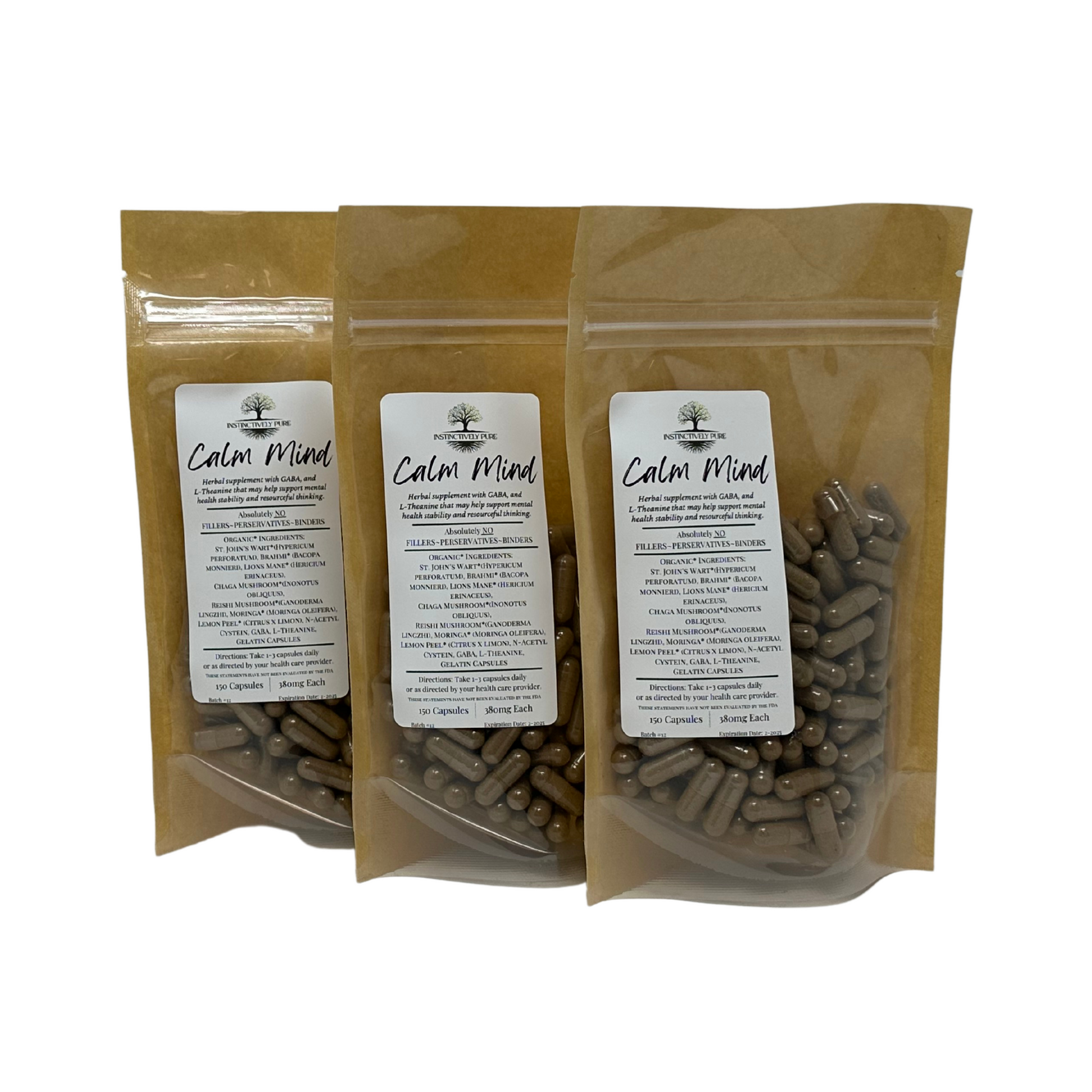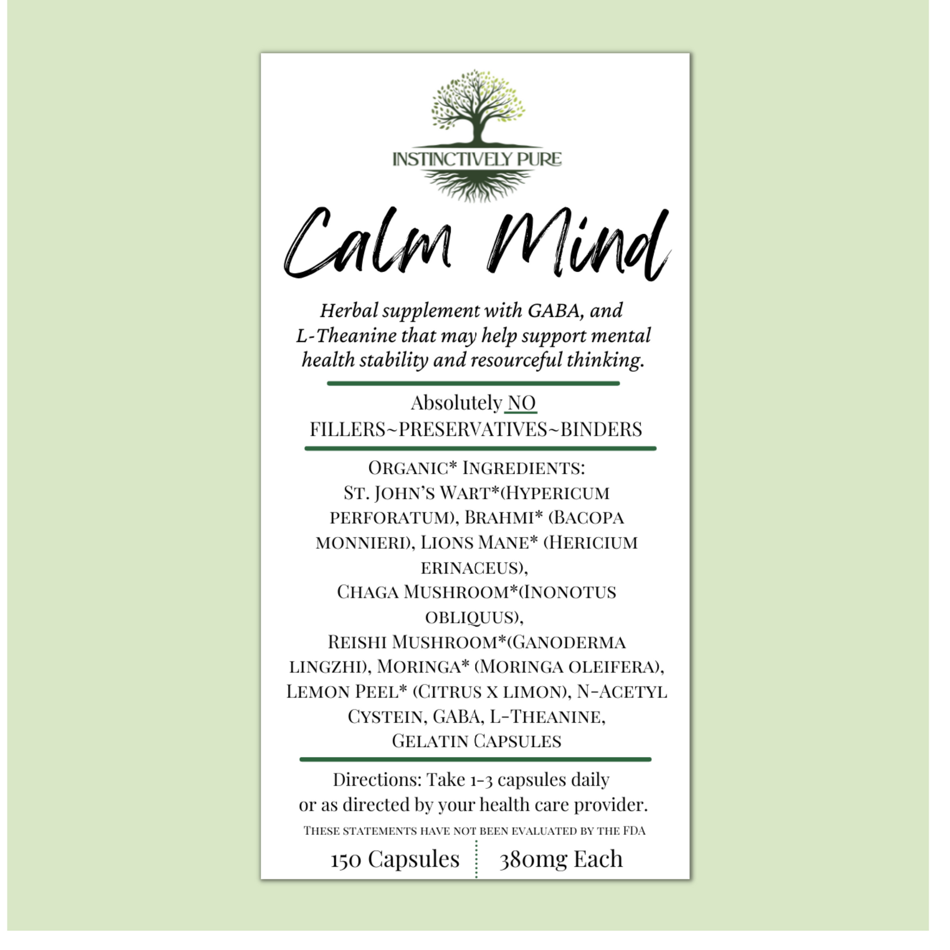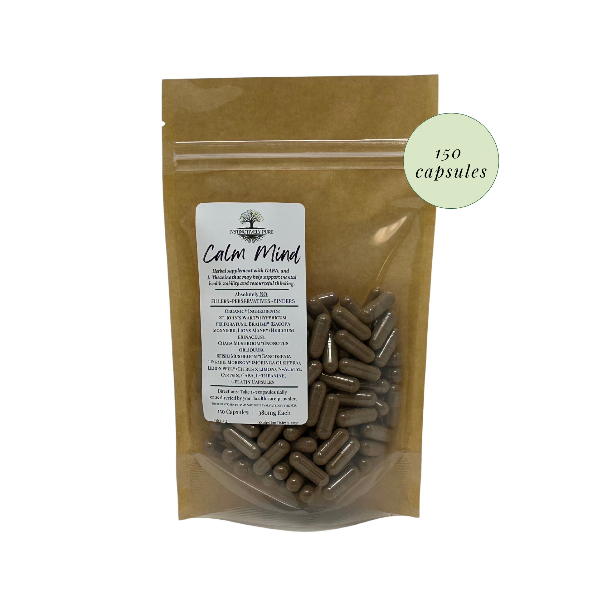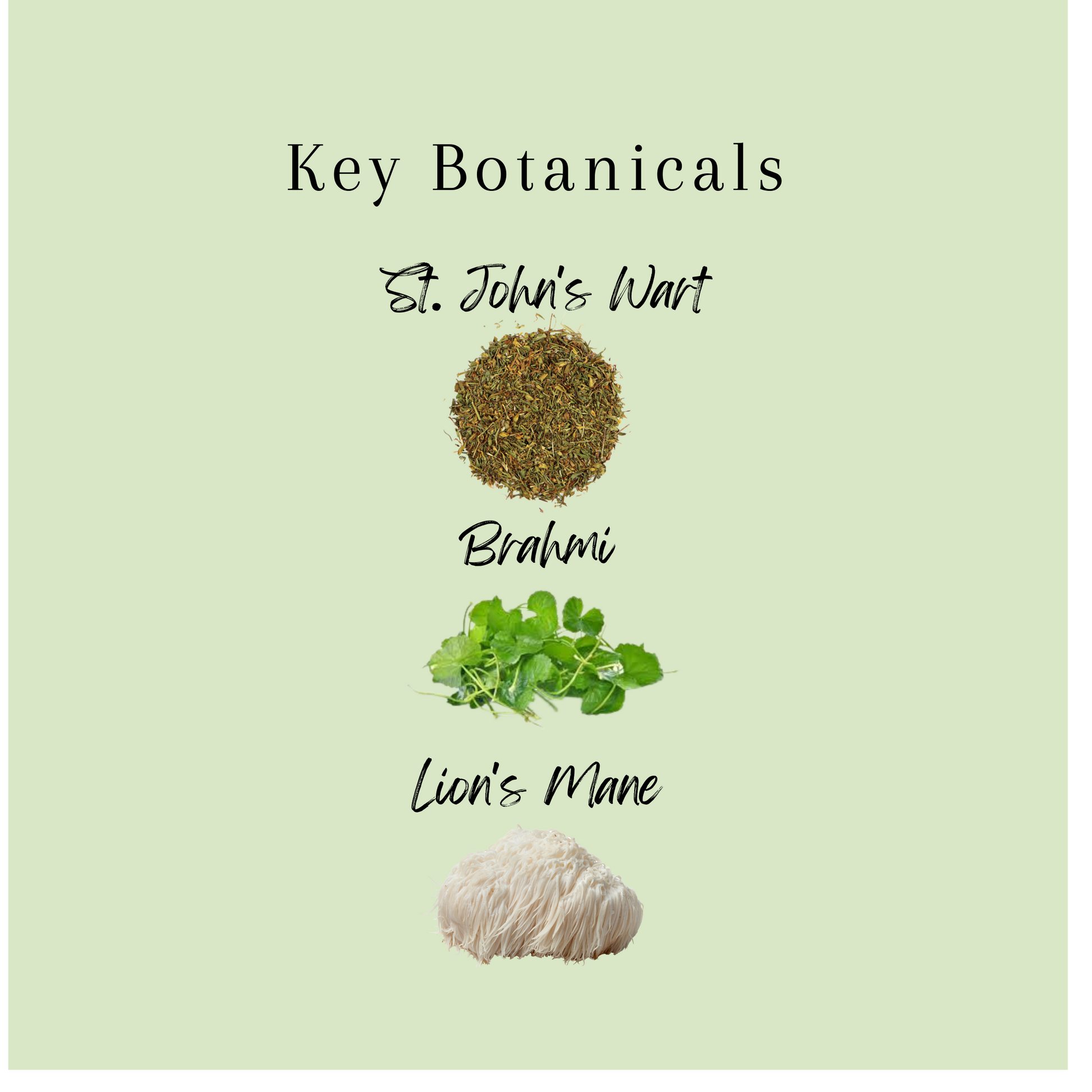 Calm Mind is a dietary herbal supplement featuring herbs that may help support positive and resourceful thinking, such as St. John's Wart, Brahmi, and three types of brain-supporting mushrooms, Lion's Mane, Chaga, and Red Reishi.