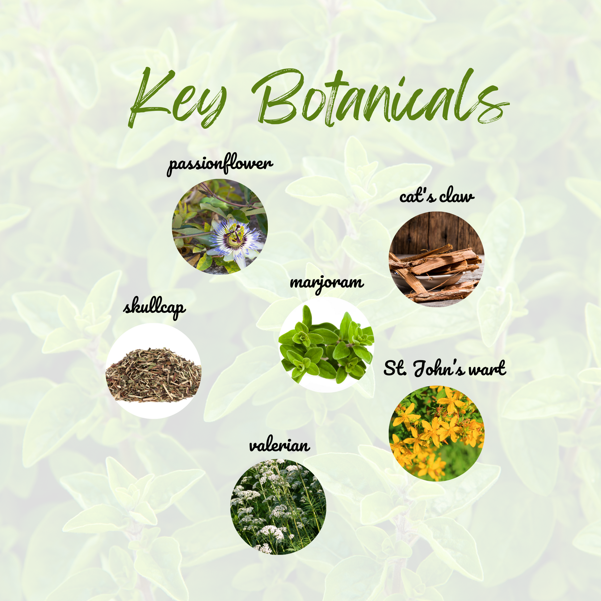 Organic* Ingredients: Passionflower* (Passiflora incarnata), Cat’s Claw* (Uncaria tomentosa), Skullcap* (Scutellaria lateriflora), Marjoram* (Origanum majorana), St. John’s Wort* (Hypericum perforatum), Holy Basil* (Ocimum tenuiflorum), Sarsaparilla Root* (Smilax regelii), Bitter Orange Peel* (Citrus aurantium), Hops* (Humulus lupulus), L-Theanine, Figwort* (Scrophularia nodosa), Lobelia Leaf* (Lobelia inflata), Horehound* (Marrubium vulgare), Valerian* (Valeriana officinalis), Melatonin, 5-Hydroxytryptophan (5-HTP), Gamma-Aminobutyric Acid (GABA), Shatavari Root* (Asparagus racemosus). Other Ingredients: Gelatin Capsules