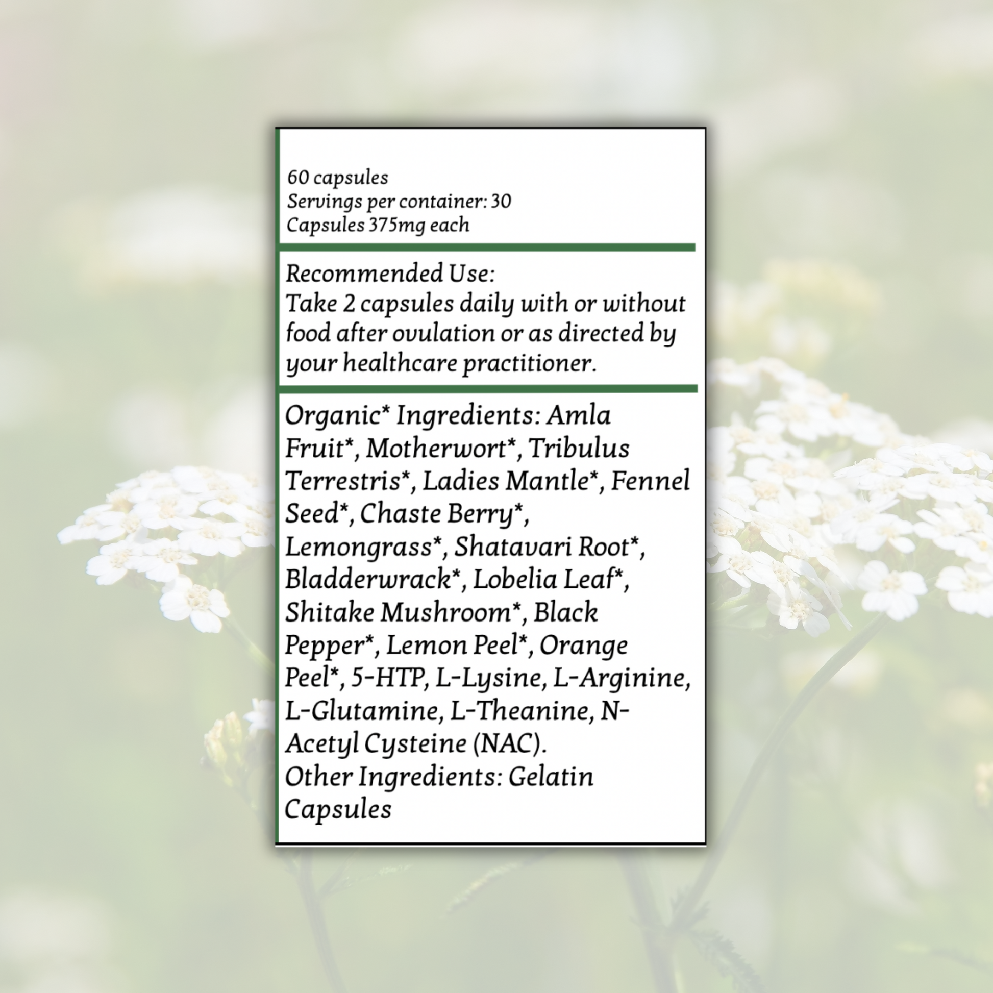 Organic* Ingredients: Amla Fruit*(Phyllanthus emblica), Motherwort*(Leonurus cardiaca), Tribulus Terrestris*, Ladies Mantle*(Alchemilla vulgaris), Fennel Seed*(Foeniculum vulgare), Chaste Berry*(Vitex agnus-castus), Lemongrass*(Cymbopogon citratus), Shatavari Root*Asparagus racemosus), Bladderwrack*(Fucus vesiculosus), Lobelia Leaf*(Lobelia inflata), Shitake Mushroom*(Lentinula edode), Black Pepper*(Piper nigrum), Lemon Peel*(Citrus x limon), Orange Peel*(Citrus x aurantium , 5-HTP, L-Lysine, L-Arginine, L-Glutamine, L-Theanine, N-Acetyl Cysteine (NAC). Other Ingredients: Gelatin Capsules