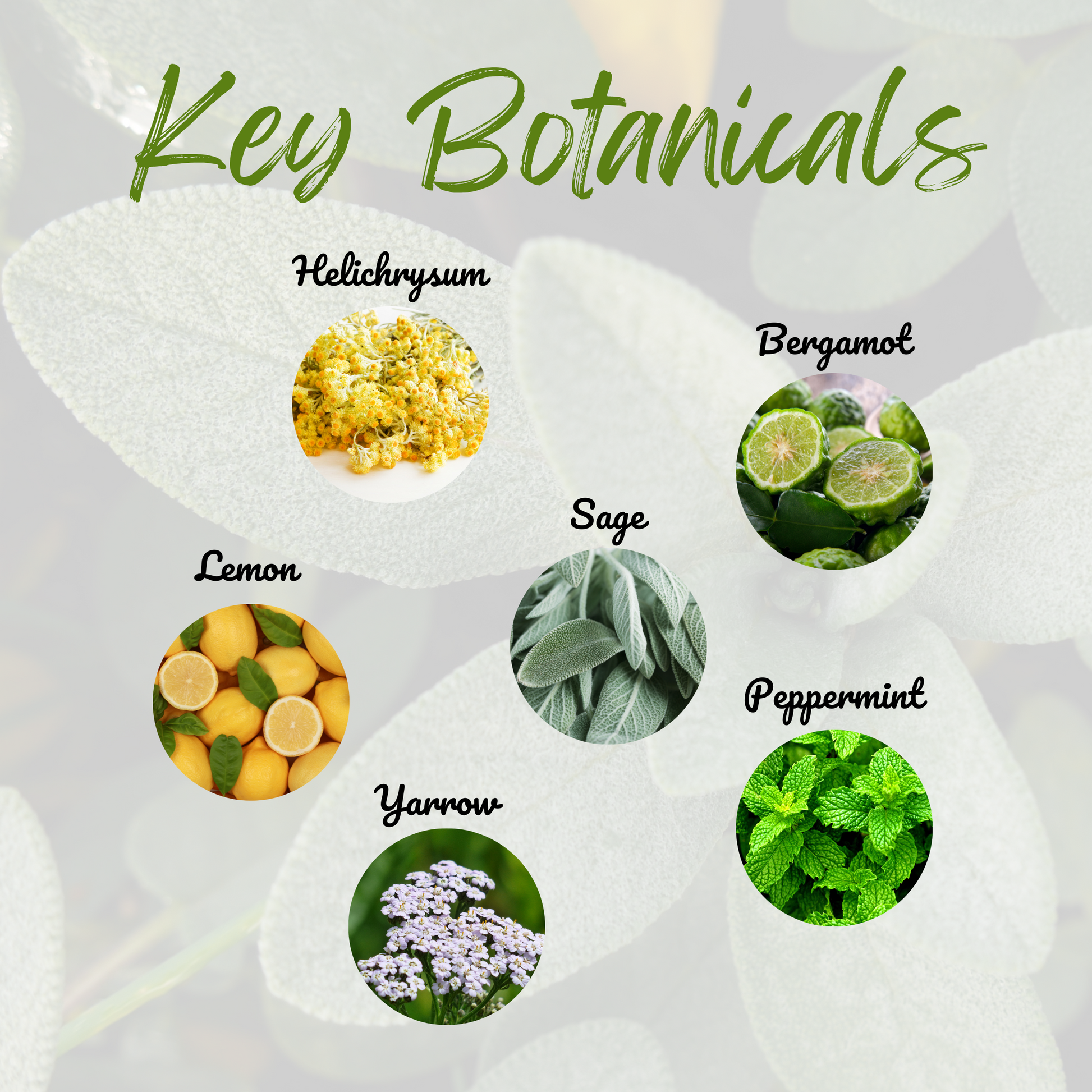 Organic MCT Coconut Oil, Essential Oils of Bergamot (Citrus bergamia), Blue Yarrow (Achillea millefolium), Green Yarrow (Achillea millefolium), Helichrysum (Helichrysum italicum), Lemon (Citrus limon), Niaouli (Melaleuca quinquenervia), Palmarosa (Cymbopogon martinii), Peppermint (Mentha piperita), Sage (Salvia officinalis), Sandalwood (Santalum album), Vetiver (Vetiveria zizanioides), and Ylang Ylang (Cananga odorata).